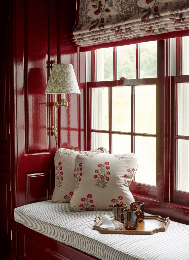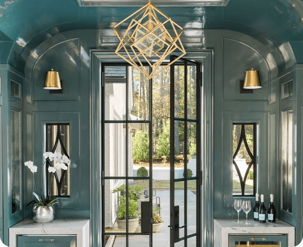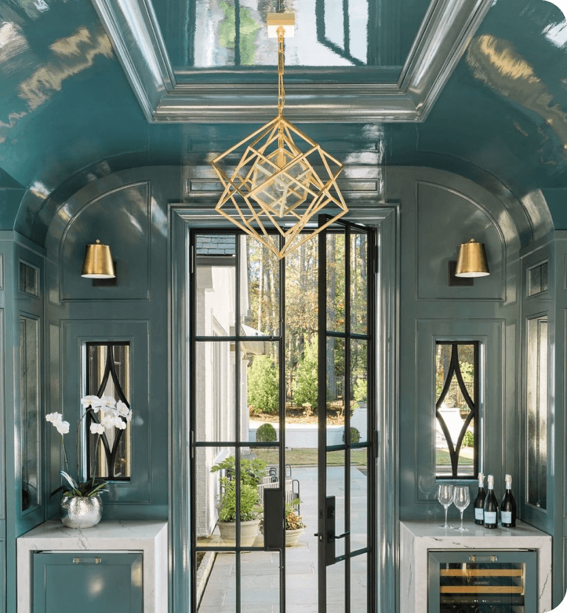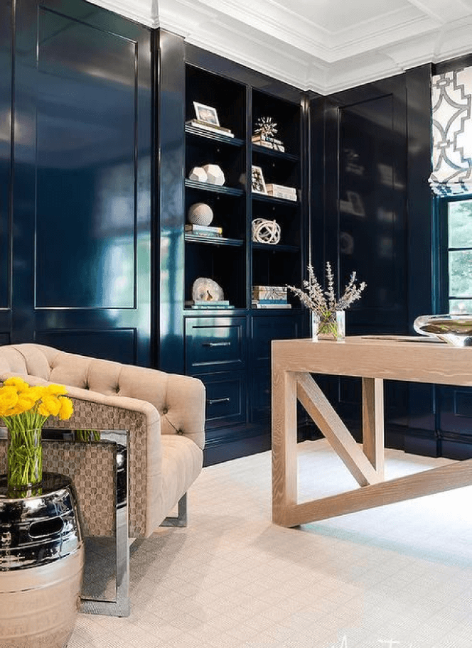 Глянец — тонкослойное покрытие, равно распределённое по поверхности, создаёт отражающий эффект. Самые смелые варианты его исполнения — насыщенные тёмные оттенки. Современные дизайнеры используют тёмные отражающие материалы, как способ реализации альтернативы. Бытует мнение, что тёмный цвет съедает пространство, но в исполнении глянца даже небольшое помещение приобретает особенный шарм.