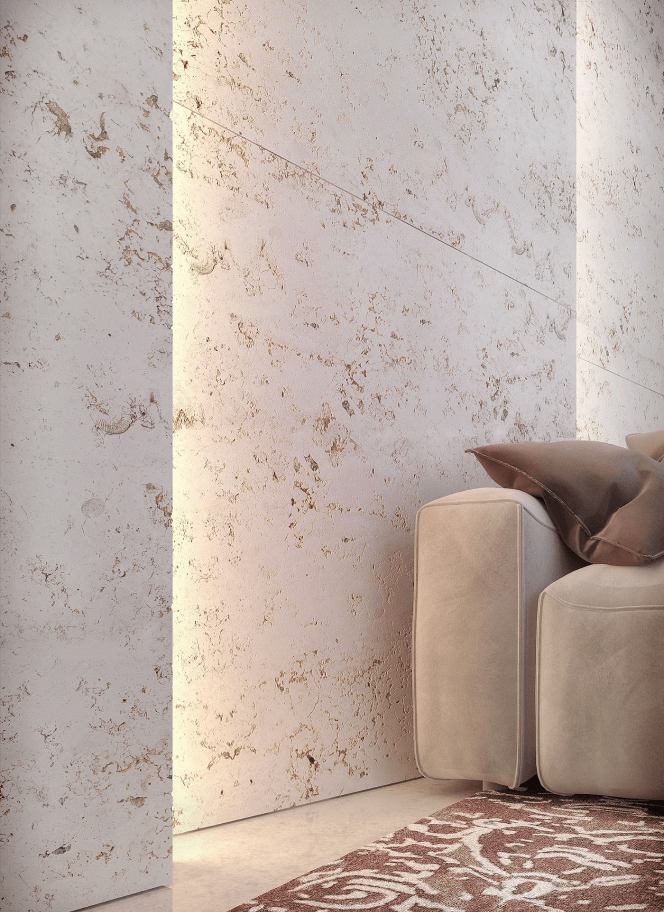 Эффект достигается за счет разно размерной фракции, входящей в состав качественного материала. Мы рекомендуем использовать колеровку в массе, а также защитное лессирующее тонирующее покрытие для придания глубины фактуры и его прочности. Также эффект Травертин отлично реставрируется, поэтому не будет вызывать больших затрат при его дальнейшей эксплуатации.